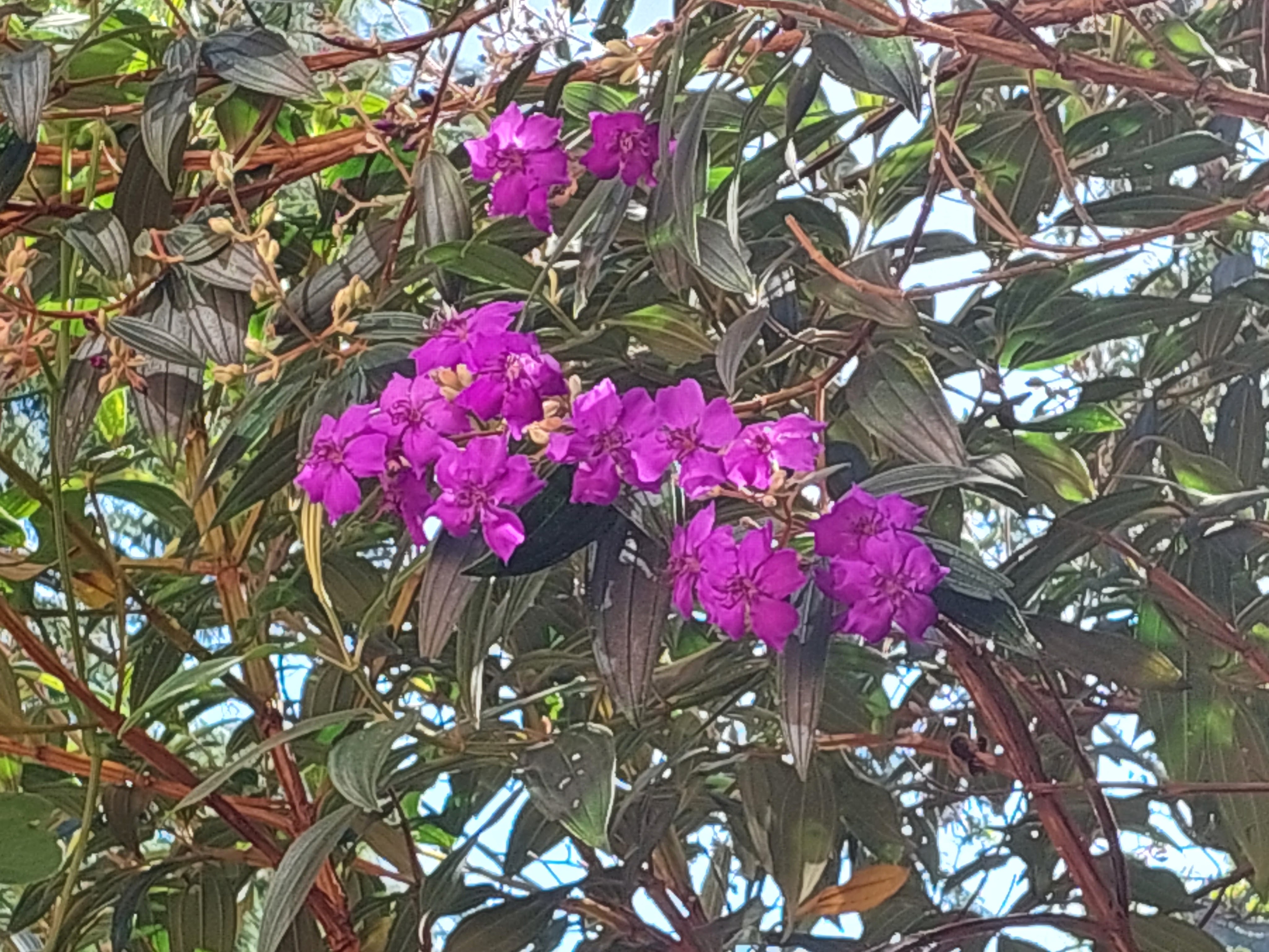 No dia seguinte, um domingo, eu abri a janela da minha casa onde moro há apenas 5 meses e me deparei com dois cachos de flores roxas em meio ao verde da mata Atlântica .